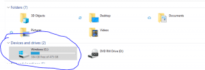You want to make sure you know your storage requirements before you start backing up your machine. It is quite easy to find out. On your Windows machine, open File Explorer and the find your system Drive. You may have more than one drive in the system but for the simplicity of this article we will work with a one drive system: