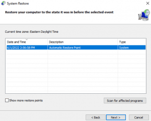 There is other options you can chose, like show more restore points if you want to restore your system further back. There is also scan for affected programs if you want to see what programs might not work after the restore. You will just have to reinstall them. I have found that the restore works well. In some case you might not get everything restored perfectly but no system at all is a lot worse. The restore will take some time and a reboot will need to be done. However, you will be working in no time! If you also follow my articles on keeping your other files and settings backed up you will have all the bases covered.
