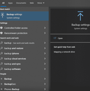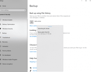 Search for Backup and Choose “Backup settings”. Have your USB Drive connected to your machine and click “Add Drive”: