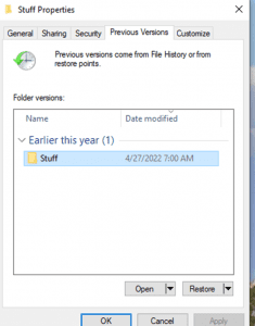 Go to the Folder where the file was located, right click, and choose properties. Then click on the previous versions tab and click the down arrow button and choose “restore to” if you want choose an alternate location.