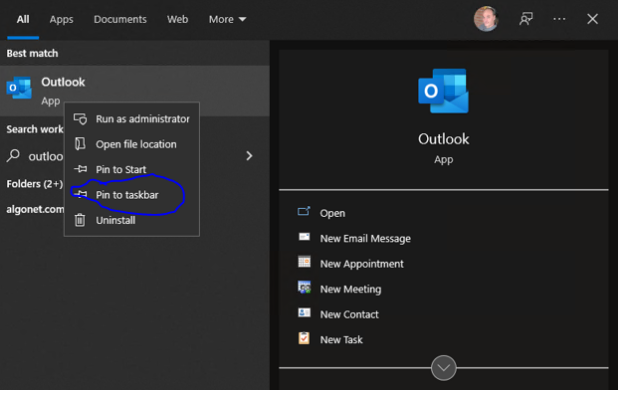 - If you would like the office apps located pinned to your task bar you just search for the office app and then right click on the search result and choose pin to task bar: